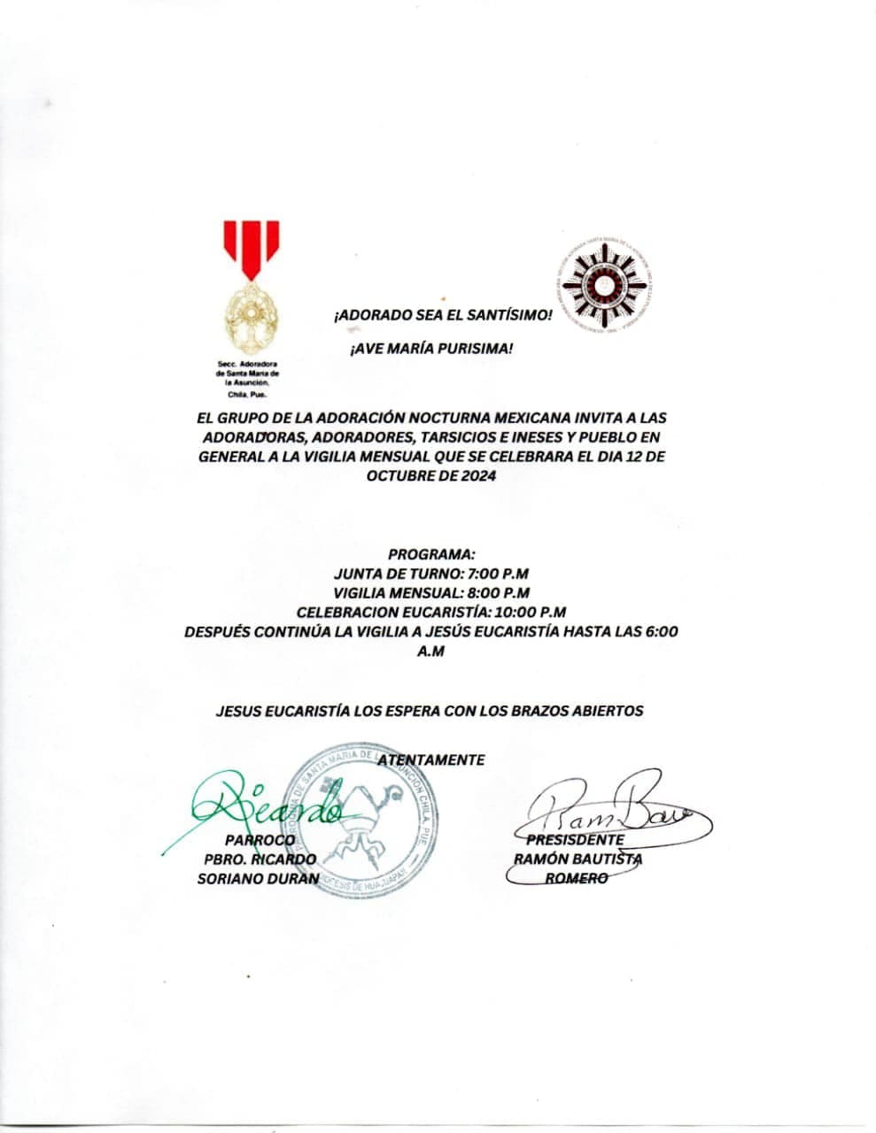 ¡Adorado sea el Santísimo Sacramento! ¡Ave María Purísima!